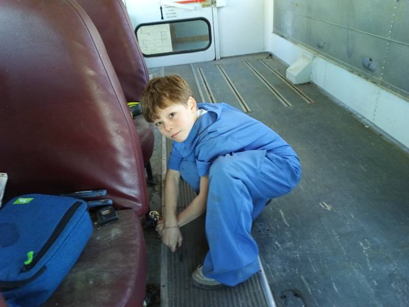 Another group continued the important—but less glamorous—task of cleaning out the interior of the bus they are renovating. The job is nearly finished, and while much of the work falls into the “Just Do It” category, it is a necessary step toward their larger vision.