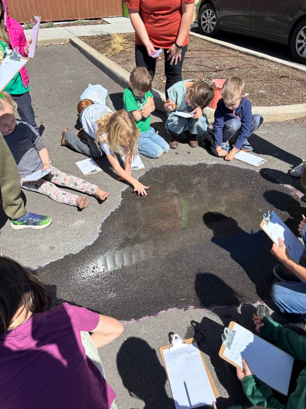You know it’s a good day when learning takes an unexpected turn. The life cycle study shifted into an exploration of the water cycle, sparked by heroes noticing a common need across animals. From experimenting at the water table trying to make water travel from one bin to the other, to observing a puddle outside for over an hour to see the transformation of water going from a liquid to a gas, their curiosity led to rich observations and thoughtful discussions.
